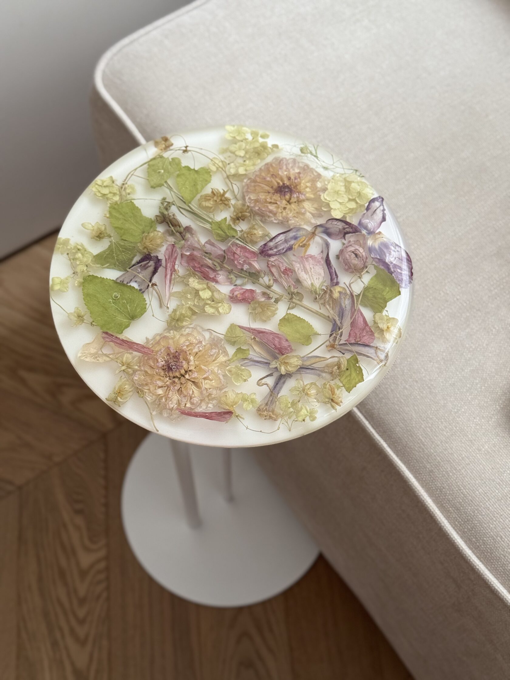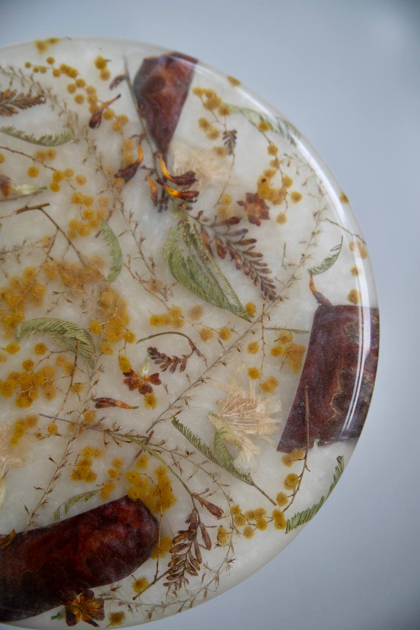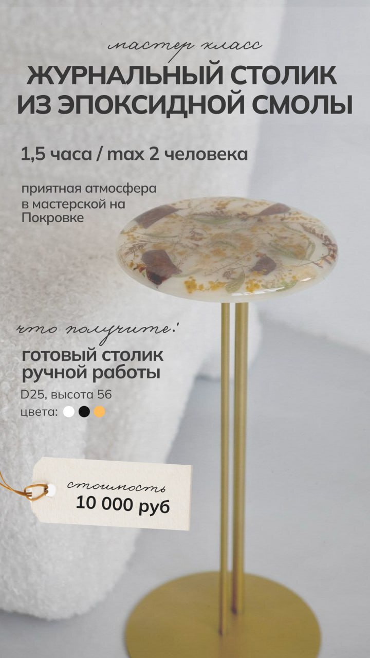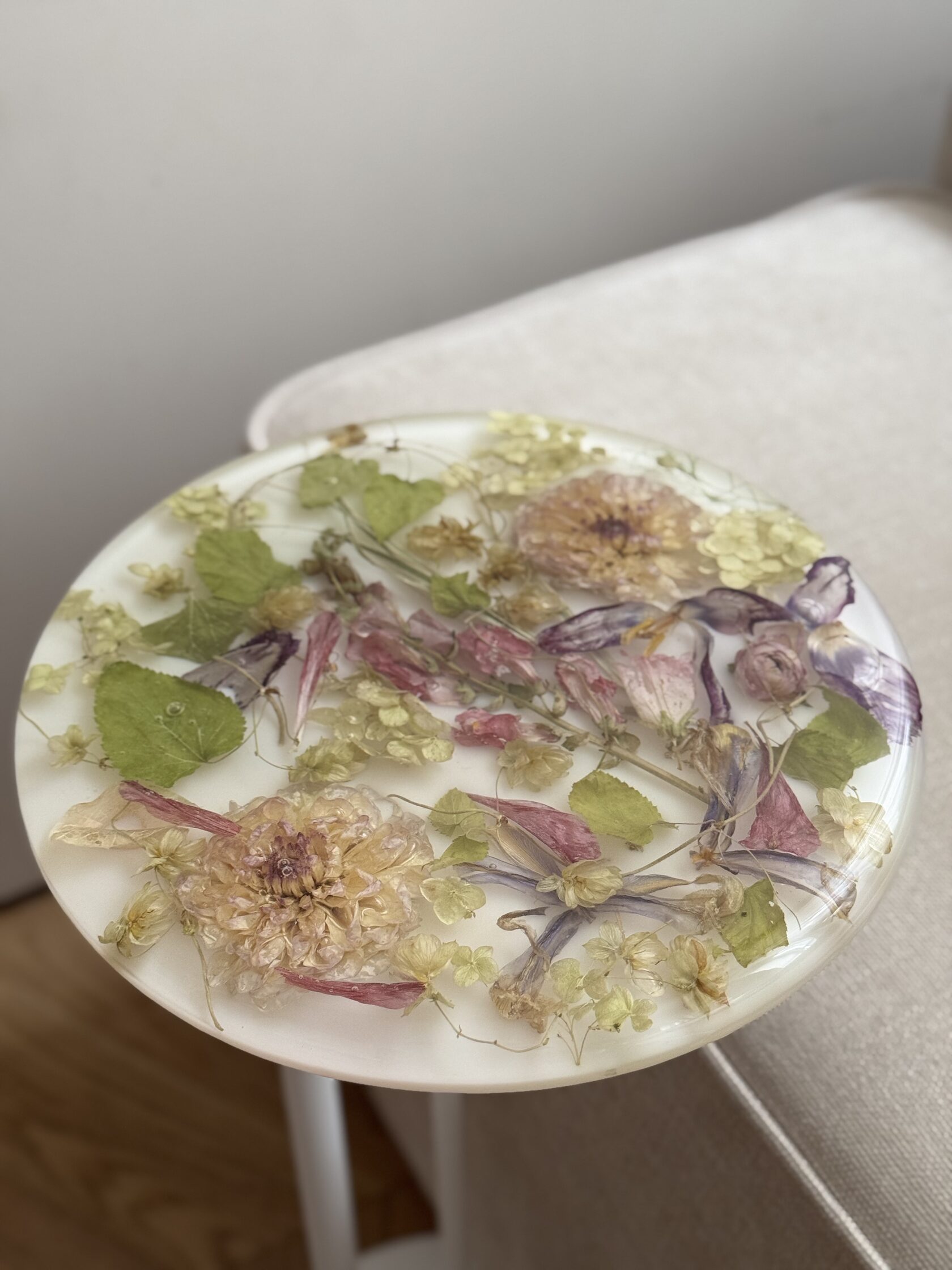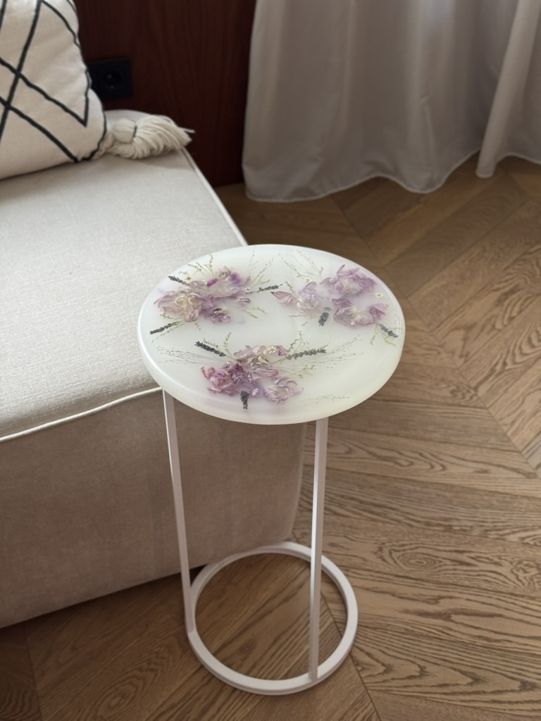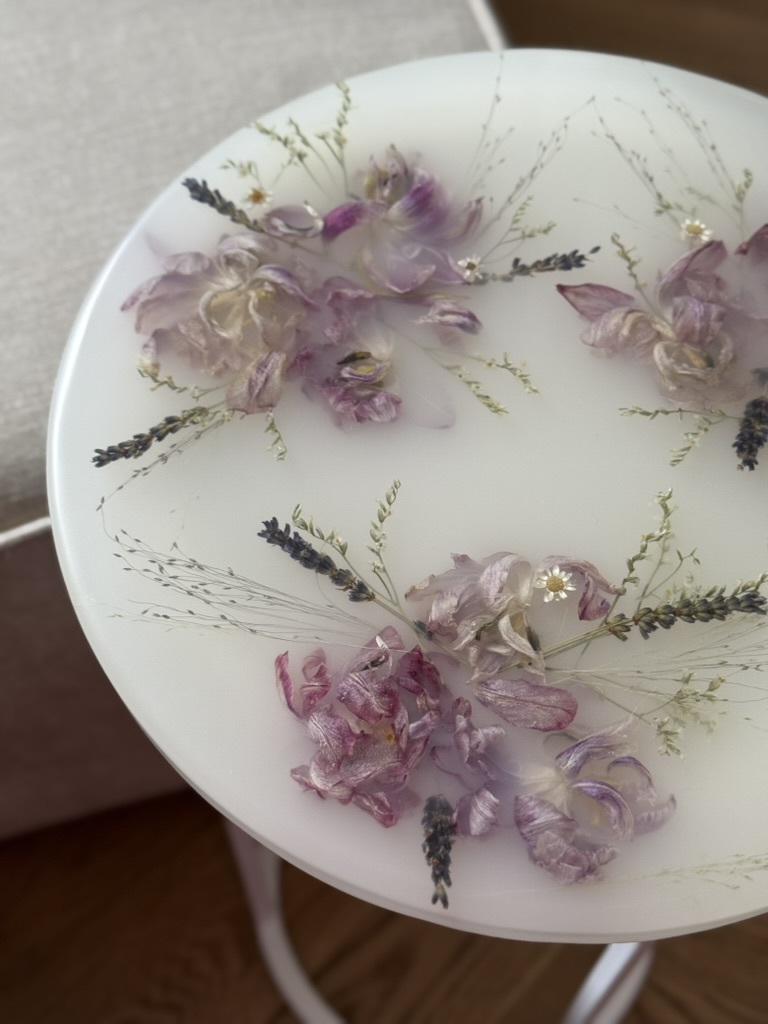 Моя дочка с каждым днем становится все подвижнее и любознательнее, но это не мешает мне развиваться и творить. Я создаю уникальные столы, зеркала, шкатулки, подносы и даже ручки для мебели, все из эпоксидной смолы с сухоцветами. Все цветы я самостоятельно собираю, выбираю и сушу. Порой это даже целое путешествие для нашей семьи, чтобы я собрала цветы для будущего проекта. Самый интересный для меня опыт - это засушить одуванчик, чтобы он не разлетелся.