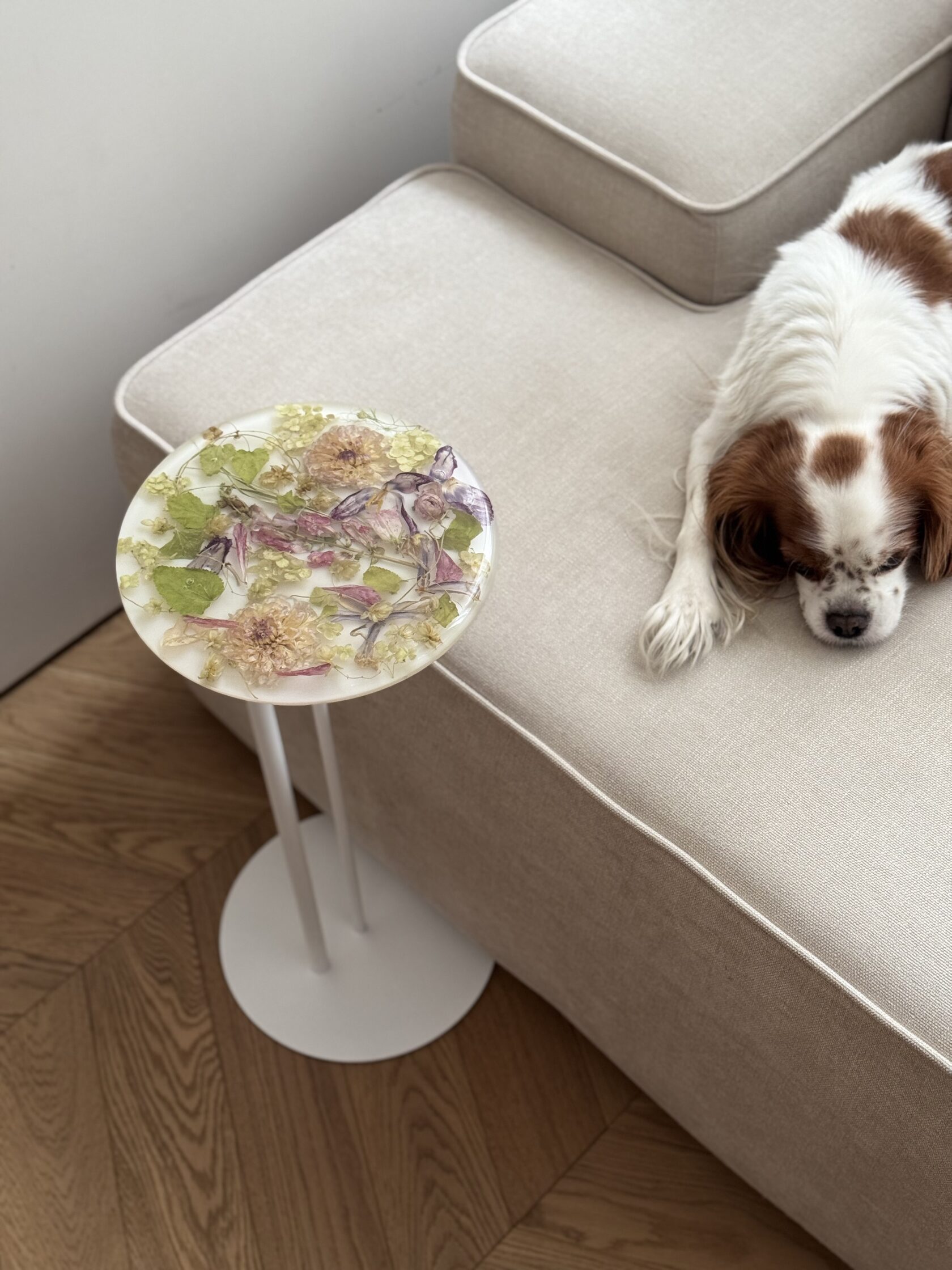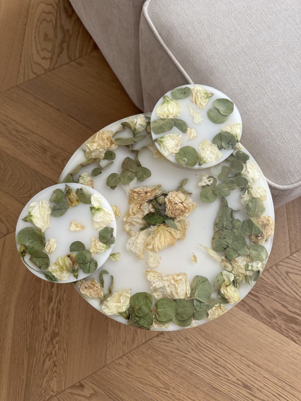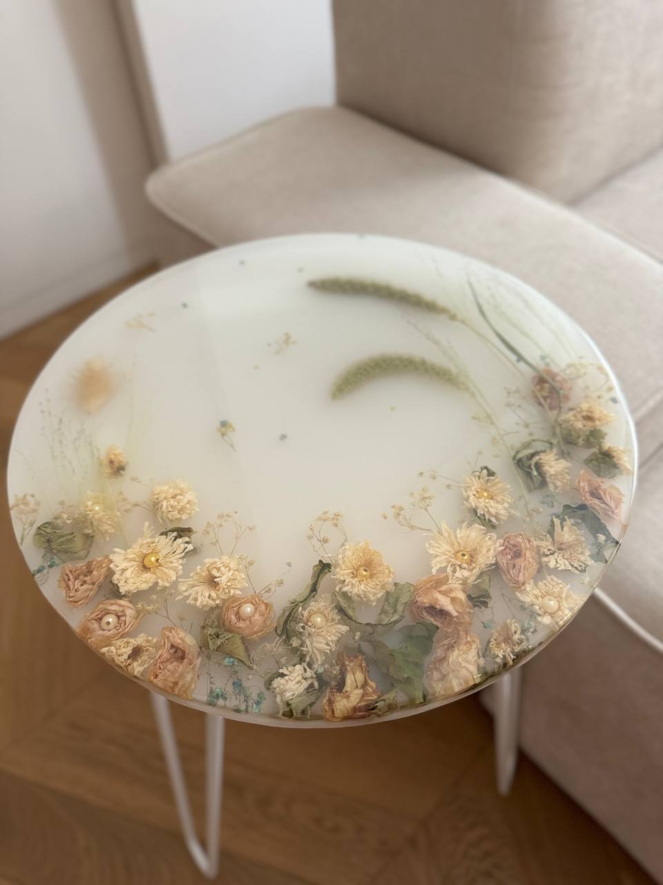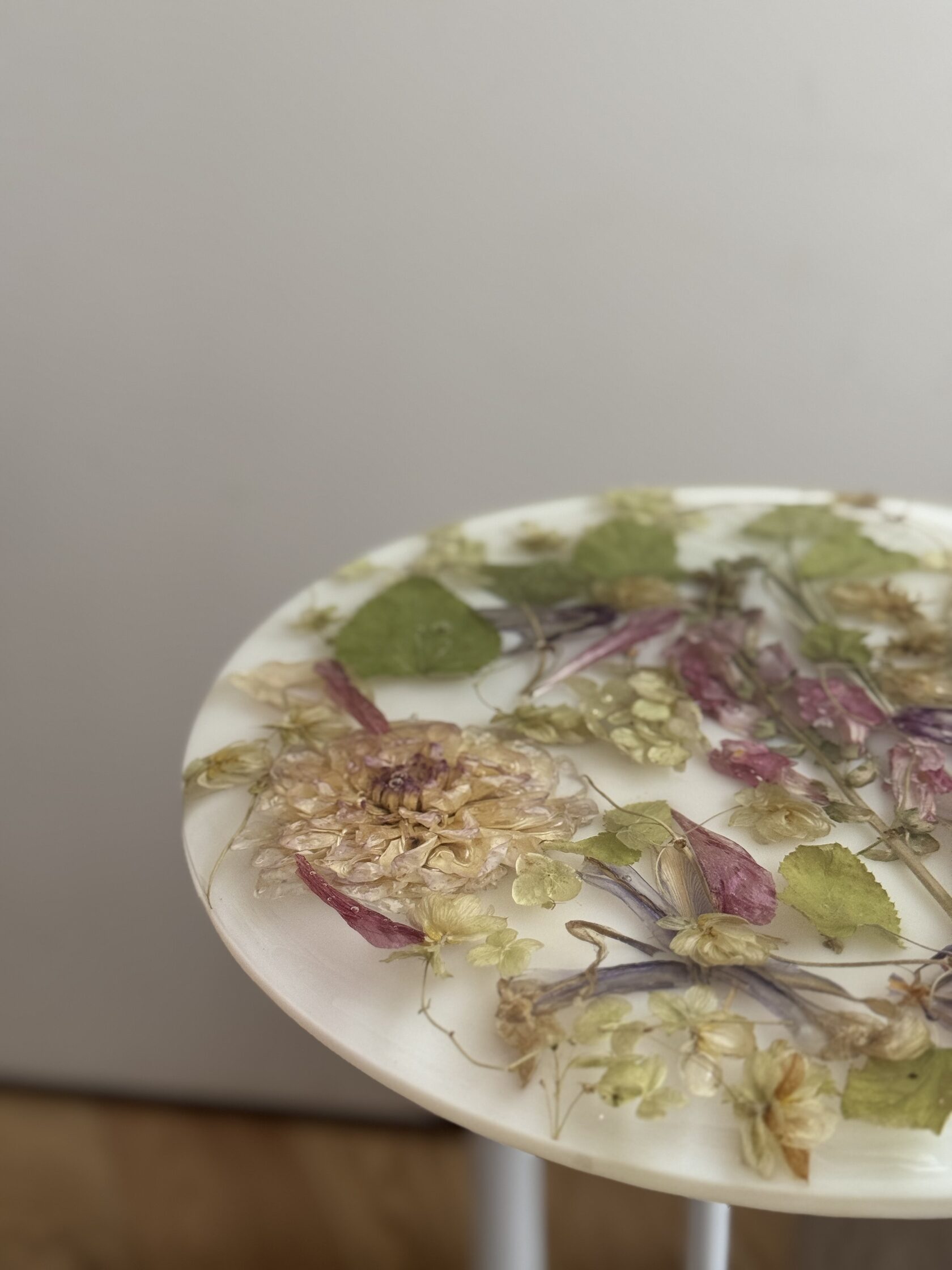 Моя дочка с каждым днем становится все подвижнее и любознательнее, но это не мешает мне развиваться и творить. Я создаю уникальные столы, зеркала, шкатулки, подносы и даже ручки для мебели, все из эпоксидной смолы с сухоцветами. Все цветы я самостоятельно собираю, выбираю и сушу. Порой это даже целое путешествие для нашей семьи, чтобы я собрала цветы для будущего проекта. Самый интересный для меня опыт - это засушить одуванчик, чтобы он не разлетелся.